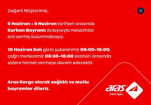 "Değerli Müşterimiz, 6 Haziran - 9 Haziran tarihleri arasında Kurban Bayramı dolayısıyla mesaimize ara vermiş bulunmaktayız. 10 Haziran Salı günü şubelerimiz 09:00-18:00, çağrı merkezimiz 08:30-18:00 saatleri arasında sizlere hizmet vermeye devam edecektir. Aras Kargo olarak sağlıklı ve mutlu bayramlar dileriz."