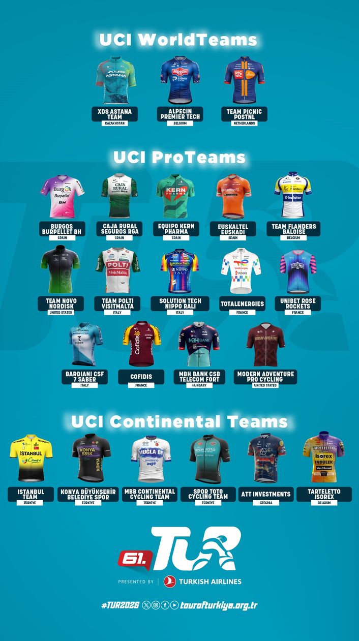 TUR 2026'da 3 Dünya Turu, 14 profesyonel ve 6 kıta takımı pelotonda mücadele verecek. İstanbul Team, Konya Büyükşehir Belediyespor, Muğla Büyükşehir Belediyespor ve Spor Toto Cycling Team olmak üzere Türkiye'den 4 takım organizasyonda yer alacak.