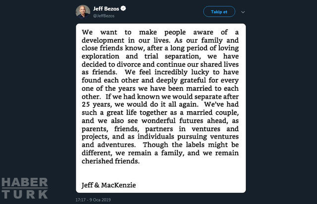 Jeff Bezos, iki gün önce sosyal medyadan yapılan açıklamayla göz önüne çıkarmadığı Mackenzie Bezos ile olan 25 yıllık evliliğini sonlandıracaklarını duyurdu.