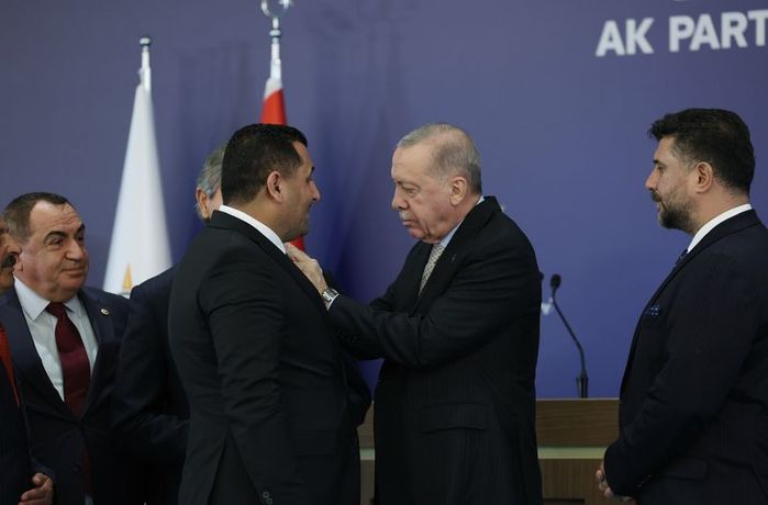 Cumhurbaşkanı Erdoğan, AK Parti Genel Merkezi'nde düzenlenen grup toplantısının ardından, AK Parti'ye katılan 7 belediye başkanına rozetlerini taktı