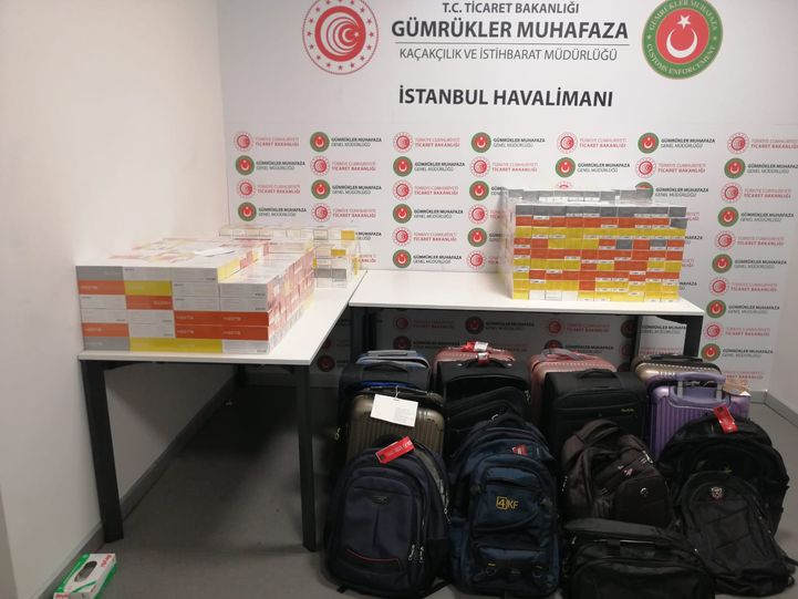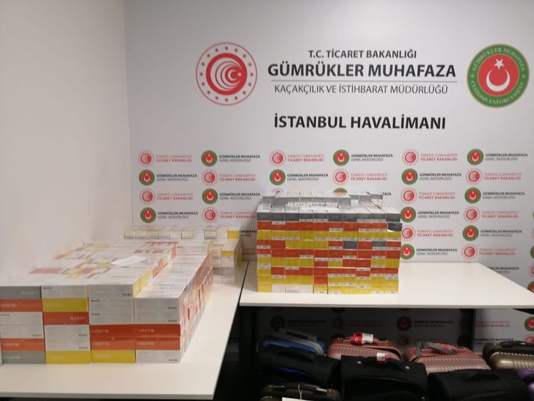 Ticaret Bakanlığı Gümrük Muhafaza ekiplerince İstanbul Havalimanı'nda düzenlenen operasyonda 7 bin 390 paket elektronik sigara tütünü ele geçirildi. Yeşil hattı kullanarak, yolcu salonundan çıkacakları sırada takipteki muhafaza memurlarınca durdurulan şüphelilere ait 9 valiz ve 6 sırt çantasında elektronik sigara tütünleri yakalandı