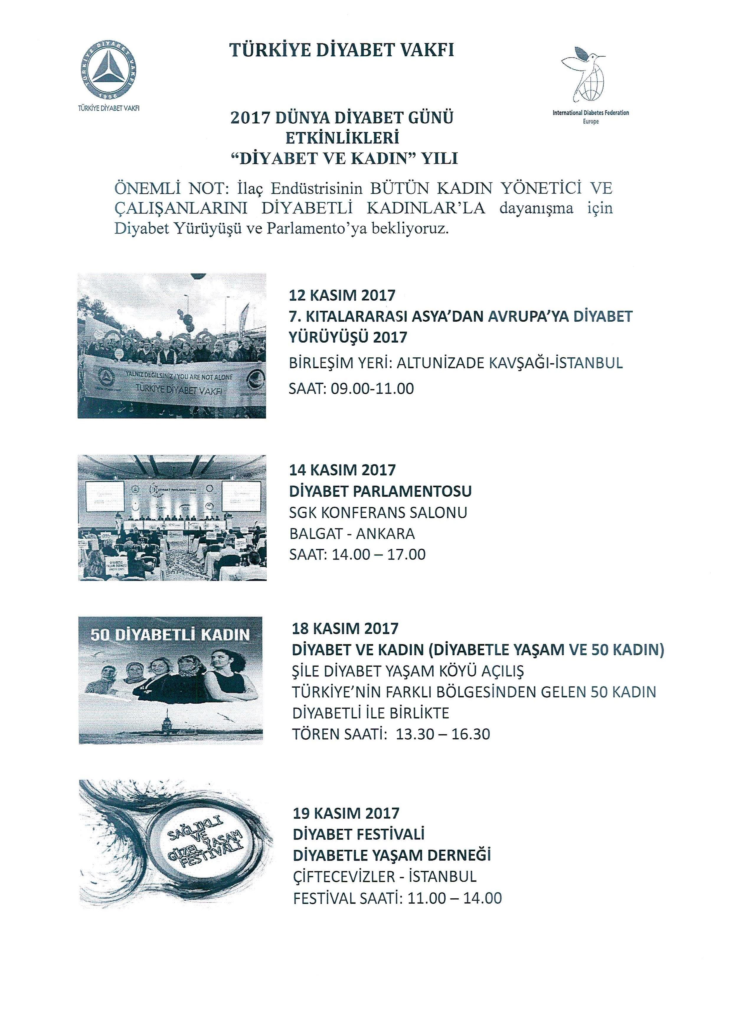 2017'nin temasını "Diyabet ve Kadın" olarak belirleyen Türkiye Diyabet Vakfı, 2017 Dünya Diyabet Günü etkinlikleri kapsamında kasım ayının belli günlerinde etkinlikler düzenlemeye devam edecek.
