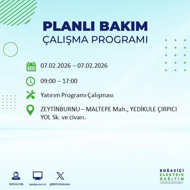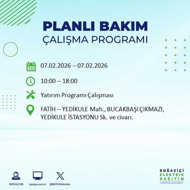 7 Şubat Cumartesi günü planlı elektrik kesintileri açıklandı. Boğaziçi Elektrik Dağıtım A.Ş. (BEDAŞ), bakım ve yatırım çalışmaları nedeniyle kent genelinde enerji kesintisi yapılacağını açıkladı. Şirketin planına göre, kesintiler birçok ilçede belirli saat aralıklarında etkili olacak. İşte ayrıntılar...