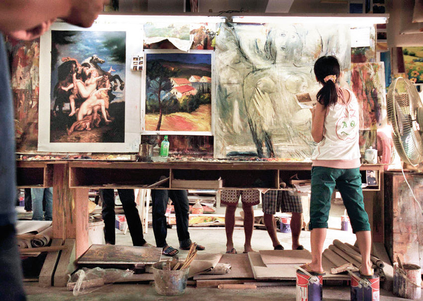 Dünyanın en büyük “çakma sanat merkezi”. Çalışma şartlarıyla da muhtemelen en ürkütücüsü. China Daily’ye göre yağlı boya tablolarda toplam küresel hacmin yüzde 60’ı burada üretiliyor. Yıllık 600 milyon dolarlık bir sanayi... Antik Roma’dan empresyoniste, baroktan Damien Hirst’e, her dönemden eser var. Yalnızca resim olsa iyi, heykel de kopyalıyorlar.