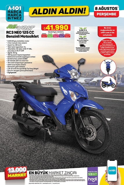 A101, 8 Ağustos Perşembe aktüel kataloğu yayınlandı. Bu hafta başta araba aksesuarları olmak üzere, yemek masası takımı, buzdolabı, benzinli motosiklet, nevresim takımı, televizyon gibi birçok parça satışa çıkıyor. İşte, A101, 8 Ağustos 2024 aktüeli...