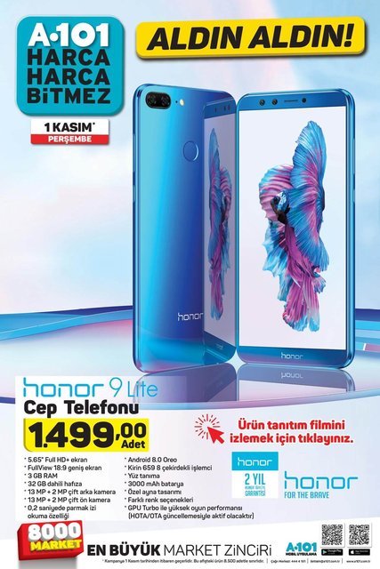 A101 1 Kasım 2018 Aktüel ürünler kataloğu geçtiğimiz hafta yayımlanmıştı! Müşteriler bugünden itibaren A101 mağazalarında LED TV ve elektrikli süpürge sürprizi haricinde bir de Honor 9 Lite cep telefonu sürprizi ile karşılaşacak. İşte A101 1 Kasım 2018 Aktüel ürünler listesi