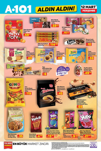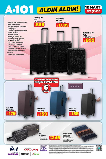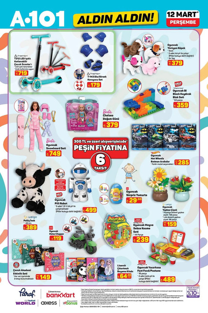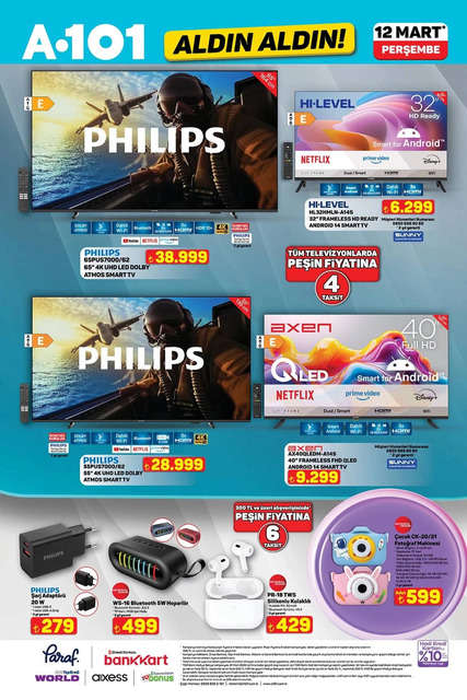 A101 12 Mart Perşembe gününe ait aktüel kataloğu belli oldu. Bu Perşembe A101 marketlerde televizyon, davlumbaz, fırın, ankastre, hoparlör, saç kurutma makinesi, elektrikili motorlu bisiklet, elektrik süpürgesi, dikiş makinesi, demlik, saklama kabı, servis tabağı, matkap, sıcak hava tabancası, testere, takım çantası, merdiven, çocuk scooterı, valiz, halı, yatak, ütü masası, pazar arabası, kamp çadırı gibi çeşitli ürünler raflarda yerini alacak. İşte A101 12 Mart 2026 aktüel broşürünün tamamı haberimizde...