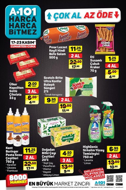 A101 aktüel ürünler kataloğu bu hafta indirime giren ürünleri incelemek isteyenler tarafından araştırılıyor. A101'de bu hafta pek çok gıda ve temizlik ürününde indirim fırsatı yer alıyor. İşte 17 - 23 Kasım A101 aktüel ürünler kataloğu