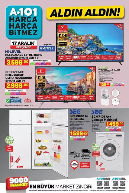 A101 17 Aralık 2020 aktüel indirimli ürünleri yarın satışa çıkıyor. A101'de bu hafta; SEG Çamaşır Makinesi, Bluetooth Kulaklık, Fantom Dikey Süpürge, Çay Makinesi, ev araç gereçleri ve gıda ürünlerinde indirimli fiyatlar raflardaki yerlerini aldı. İşte 17 Aralık A101 indirimli ürünler listesi...