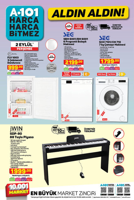 A101 2 Eylül 2021 Aktüel ürünler kataloğu yayınlandı, A101'de bu hafta neler var? sorusunun yanıtı belli oldu. A101 marketlerde bu hafta beyaz eşyadan küçük ev aletlerine, elektrikli scooterdan kamp sandalyelerine kadar pek çok ürün indirimli fiyatlarla raflardaki yerini aldı. İşte A101 Aktüel ürünler kataloğu 2 Eylül 2021