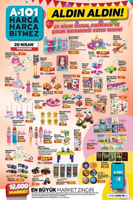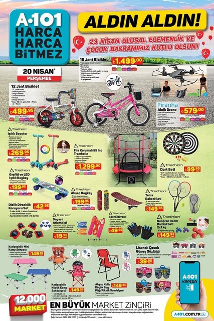 A101 20 Nisan 2023 kataloğu, 23 Nisan Ulusal Egemenlik ve Çocuk Bayramı ve Ramazan Bayramı'na özel ürünleri ile yayınlandı. 20 Nisan Perşembe A101 aktüel ürünler kataloğunda yer alan lüks marka cep telefonu 41 bin 499 TL'ye satışa sunuldu. İndirim kataloğunda yer alan robot süpürge, lazer projeksiyon 20 Nisan gününden itibaren A101'in resmi internet sitesi üzerinden satışa sunuldu. İşte A101 20 Nisan 2023 kataloğu indirimli fiyat listesi...