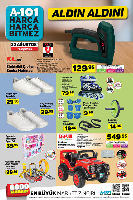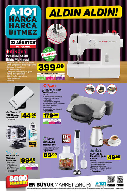 A101 22 Ağustos Aktüel ürünler kataloğu çıktı. İndirim takipçileri bu hafta A101'de birbirinden çeşitli indirimli ürünlere sahip olacak. A101 22 Ağustos Aktüel ürünler kataloğunu baktığımızda teknoloji, ev araç gereçleri, gıda ve temizlik ürünlerinde sürpriz kampanyalar mevcut. İşte A101 22 Ağustos Aktüel ürünler kataloğu...