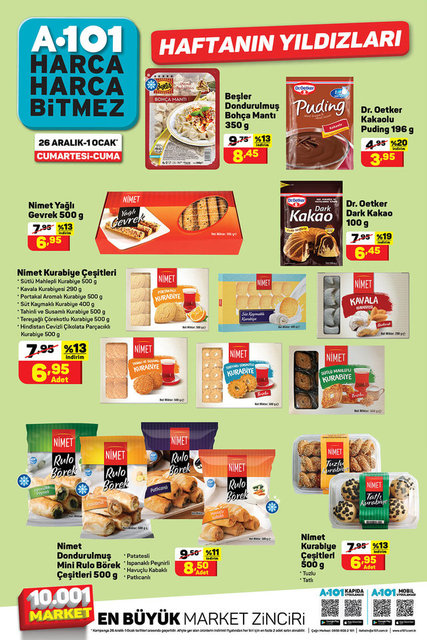 A101 26 Aralık 2020 aktüel ürünler kataloğu çıktı. A101'de bu hafta indirimli; Şahin Pastırma, Pantene Şampuan, Danet Sucuk, Ariel Toz Deterjan, Muratbey Kaşar Peyniri, Nestle Crunch gibi ürünlerde indirimli fiyatlar raflardaki yerlerini aldı. İşte 26 Aralık A101 indirimli ürünler listesi...