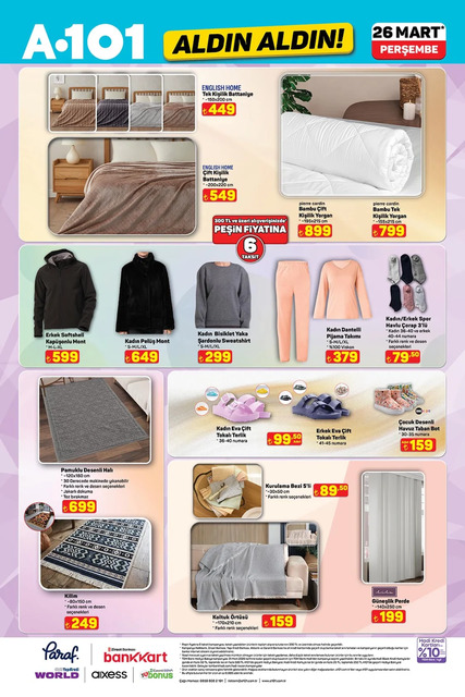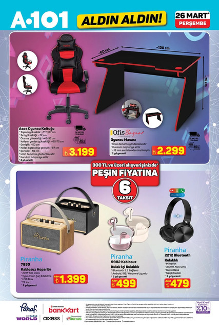 A101 marketlerin 26 Mart aktüel kataloğu belli oldu. Bu Perşembe günü A101 marketlerde satışa çıkacak televizyon, oyuncu koltuğu, oyuncu masası, kablosuz hoparlör, bluetooth kulaklık, davlumbaz, fırın, cam ocak, buzdolabı, blender seti, çay makinesi, şarjlı dikey süpürge, erkek bakım seti, şarjlı rondo, benzinli motosiklet, elektrikli moped, çapa motoru, budama makası, elektrikli üfleyici, üç çekmeceli organizer, pipetli ayıcık bardak, saklama kabı, halı, bin parça puzzle gibi çeşitli ürünler raflarda yerini alacak. İşte İşte A101 26 Mart Aldın Aldın broşürü haberimizde...