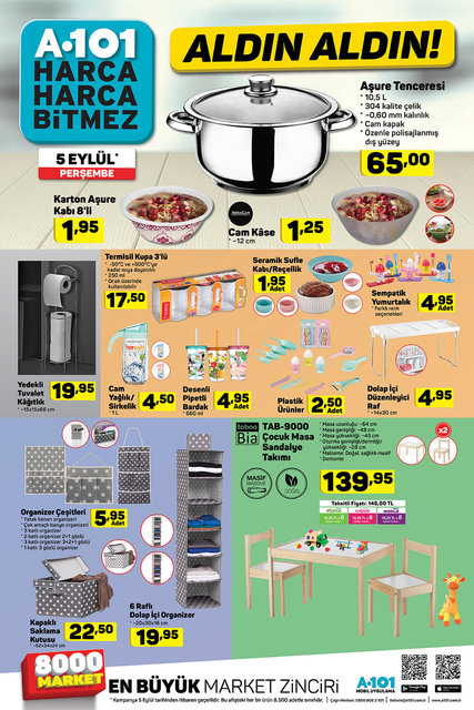 A101 5 Eylül 2019 aktüel ürünleri yarın satışa çıkacak. Perşembe günleri indirimli ürün satan A101 mağazalarında bu hafta hangi ürünlerde indirim yapacak? İndirim takipçilerini sevindirecek birçok farklı kategoride indirim mevcut olacak. İşte A101 5 Eylül 2019 aktüel ürünleri