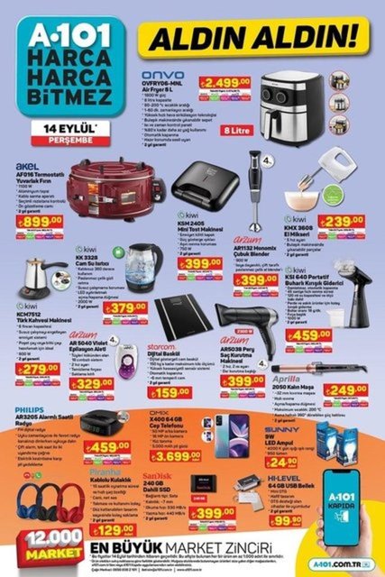 A101'de bu perşembe beyaz eşya ve teknoloji fırsatları dikkat çekiyor. Güncel A101 aktüel kataloğunda; teknolojik aletler, mutfak araç gereçleri ve kozmetik ürünlerin yanı sıra küçük ev aletleri, beyaz eşyalar, giysi çeşitleri, temel gıda ve ihtiyaç ürünleri yer alıyor. İşte 14 Eylül Perşembe A101 aktüel ürünler listesi...
