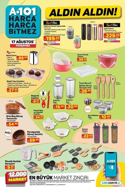 A101 aktüel 17 Ağustos kataloğu yayınlandı. Alışveriş takipçileri tarafından merak edilen yeni katalog ile onlarca ürün alıcılarıyla buluşmaya hazırlanıyor. 17 Ağustos kataloğunda; beyaz eşyalar, küçük ev aletleri, gıda ve teknoloji ürünleri, giysi çeşitleri, kozmetik malzemeler, temel ihtiyaç ürünleri ve daha birçok ürün raflarda yerini almaya hazırlanıyor. İşte 17 Ağustos 2023 A101 aktüel ürünler kataloğu tam liste...