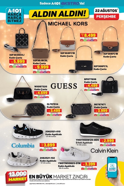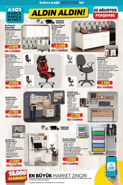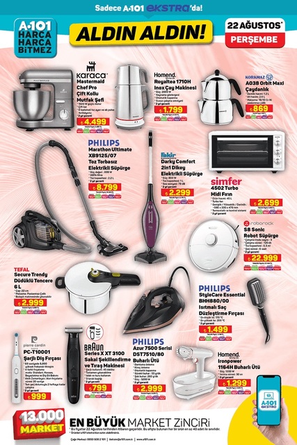 22 Ağustos 2024 A101 aktüel ürünler kataloğu yayımlandı. Böylece A101'in Perşembe indirimleri belli oldu. Market zinciri, bu hafta da onlarca indirimli ürünle raflarını güncelledi Kataloğa göre bugün teknolojik aletler, katlanır yataklı koltuk, beyaz eşya, küçük ev aletleri, mutfak araç gereçleri, temel gıda ve ihtiyaç ürünleri indirimli fiyatlarla alıcısını bekliyor olacak. 3.60 metrelik çekme karavan ve elektrikli motorlu bisiklet ise en dikkat çeken ürünler oldu. Peki, A101'de bu hafta neler var? İşte, A101 aktüel 22 Ağustos 2024 kataloğu...