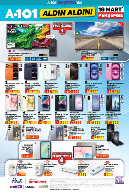 A101'de 19 Mart 2026 tarihli aktüel katalog detayları açıklandı. "Aldın Aldın" etiketiyle satışa sunulacak yeni ürünler arasında teknoloji ve ev yaşamına yönelik birçok seçenek bulunuyor. Televizyondan ankastre fırına, süpürgeden telefona kadar farklı kategorilerdeki ürünler, sınırlı stok ve çeşitli fiyatlarla alıcılarla buluşacak. İşte ayrıntılar...