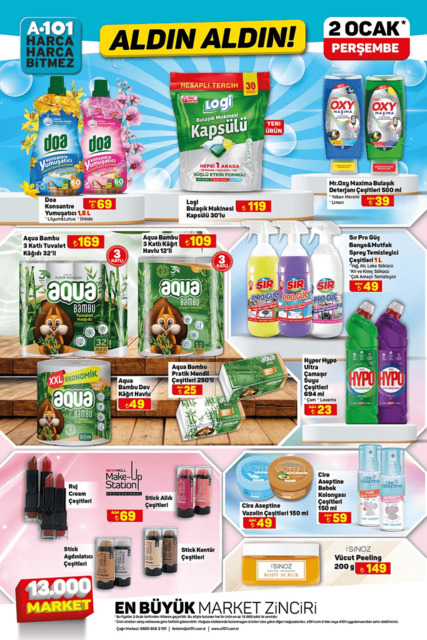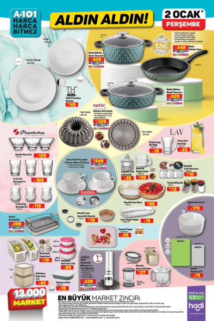 Yeni yıla girilirken A101 2 Ocak aktüel ürünler kataloğu yayınlandı. 2 Ocak'tan itibaren A101 indirimlerinde blender,bulaşık makinesi, çamaşır makinesi, televizyon, buzdolabı yer alacak. Öte yandan tekstil ürünlerinde de perdeler olacak. A101 aktüel ürünler kataloğunun tamamı yayınlandı. İşte 2 Ocak Perşembe A101 aktüel ürünler kataloğu
