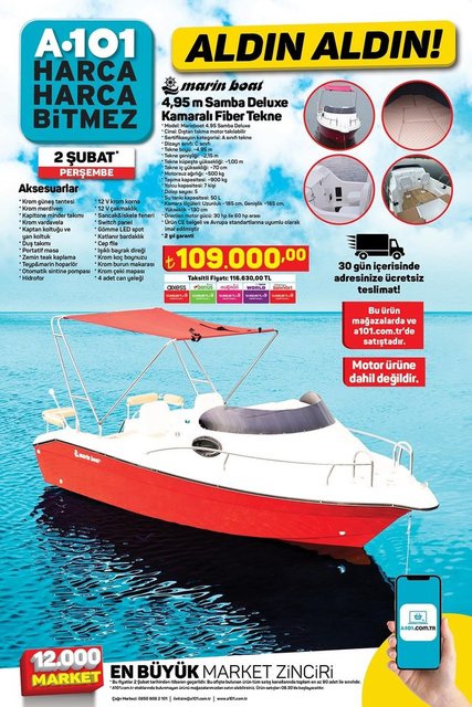 A101 aktüel ürünler kataloğu indirim listesi, her hafta olduğu gibi bu hafta da paylaşıldı. 2 Şubat Perşembe A101 aktüel ürünler kataloğunda beyaz eşya çeşitlerinden küçük ev aletlerine, temizlik malzemelerinden kişisel bakım ürünlerine kadar onlarca ürün indirimli fiyatıyla satışa çıkıyor. İndirim listesinde yer alan 4,95 m Kamaralı Fiber Tekne dikkat çekti. İşte, 2 Şubat 2023 Perşembe A101 aktüel ürünler kataloğu tam indirim listesi...