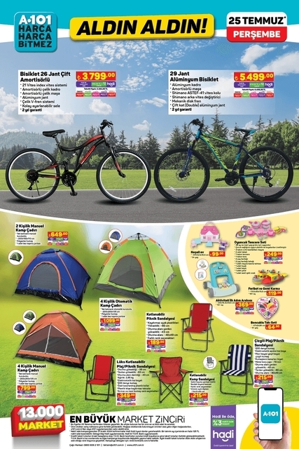 A101 aktüel ürünler kataloğu indirimli listesi belli oldu. İhtiyaçlara yönelik alışveriş yapmak isteyenler A101 indirimli ürünler listesini araştırıyor. 25 Temmuz A101 kataloğunda benzinli motosiklet, kamp malzemeleri, bisiklet, hasır çanta gibi ürünler var. Teknoloji, beyaz eşya ve daha fazlasında büyük indirimler için en yakın mağazayı ziyaret edebilirsiniz. İşte, 25 Temmuz Perşembe A101 aktüel ürünler kataloğu indirim listesi