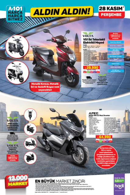 A101 aktüel ürünler kataloğunda bu hafta elektrikli moped indirimi var. Elektrikli moped dışında dikiş makinesi, televizyon, kamp tencere seti 3'lü indirimli ürünler arasında yer aldı. A101 indirimlerinden yararlanmak isteyenler a101 aktüel ürünler kataloğunda neler var sorusuna yanıt arıyor. 28 Kasım A101 aktüel ürünler aldın aldın katalog listesi haberimizde yer alıyor. İşte A101 aktüel ürünler kataloğu