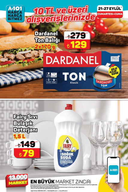 A101 aktüel ürünler kataloğu belli oldu. 21-27 Eylül tarihleri arasında geçerli olacak A101 indirimlerinde yer alan ürünler merak ediliyor. Tarabya Tam Yağlı Kaşar Peyniri 1 kg 215 TL, ve Marmarabirlik Siyah Zeytin 800 gr 109 TL gibi temel gıda ürünleri indirimer arasında yer alıyor. İşte A101 aktüel kataloğu indirimli ürünler listesi