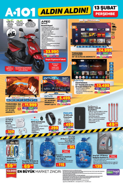 A101 aktüel ürünler kataloğu 13 Şubat Perşembe günü indirimlerini duyurdu. Her hafta farklı ürünlerin indirime girdiği markette bu hafta dik süpürge, benzinli moped var. A101 indirimlerini kaçırmak istemeyen vatandaşlar, A101'in güncel indirimli aktüel ürünler kataloğunun tamamını araştırıyor. İşte 13 Şubat A101 markette bu haftanın indirimleri.