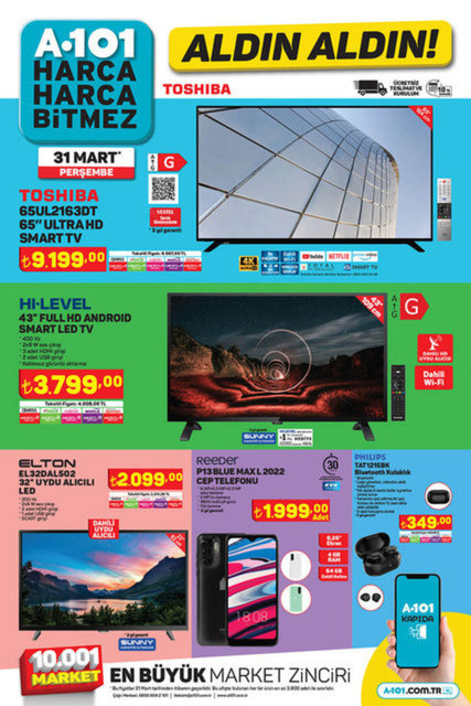 11 ayın sultanı Ramazan ayına kısa bir süre kala A101'in Ramazan indirimli aktüel ürünler kataloğu yayınlandı. A101'de bu hafta, Toshiba 65'' Ultra HD Smart TV, Reeder P13 Blue Cep Telefonu, SEG Turbo Fırın, Singer Dikiş Makinesi, Samsung Cyclone Süpürge, Homend Türk Kahve Makinesi göze çarpıyor. İşte A101 aktüel ürünler kataloğu listesi...