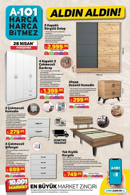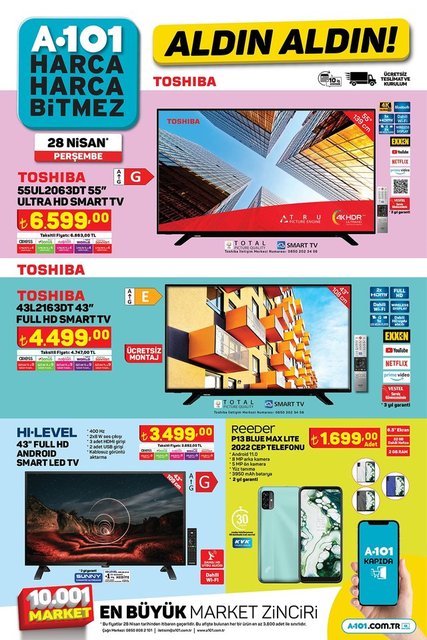 A101 aktüel ürünler kataloğunda yer alan indirimli ürünler, alışveriş severler tarafından yakından takip ediliyor. Her hafta olduğu gibi bu hafta da yayınlanan 28 Nisan A101 indirimli ürünler listesinde yer alan; televizyon, cep telefonu, dikiş makinesi, midi fırın, tost makinesi, şarjlı süpürge, dijital baskül, benzinli motosiklet, 2 kapaklı sürgülü dolap ve tek kişilik karyola'ya kadar onlarca ürün bugün satışa sunuluyor. İşte, 28 Nisan A101 Aktüel ürünler kataloğu...