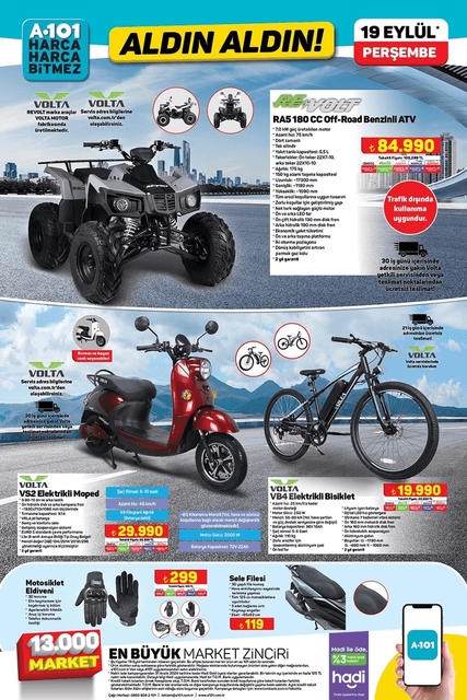 A101 Aldın Aldın kataloğu yayınlandı. 19 Eylül'den itibaren A101 şubelerinde olacak aktüel ürünlerde bu hafta; çekme karavan, benzinli ATV, elektrikli moped ve elektrikli bisiklet başı çekiyor. Bunun dışında mobilya, televizyon, beyaz eşya ve küçük ev aletlerinden onlarca ürün de satışta olacak. İşte, A101 Aldın Aldın 19 Eylül 2024 aktüel kataloğu...