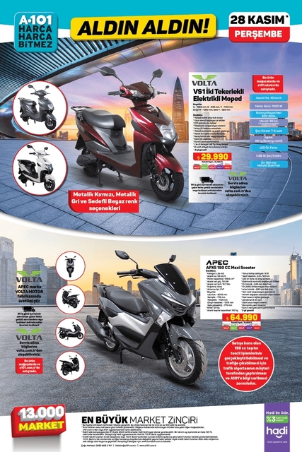 A101, 28 Kasım aktüelini yayınladı. Bu haftaki 'Aldın Aldın' kataloğunda; iki tekerlekli elektrikli moped, beyaz eşya, küçük ev aletleri, televizyon, masa takımı, kamp malzemeleri, mutfak gereçleri, ev tekstili, hazır giyim olmak üzere yüzlerce ürün geliyor. İşte, A101 28 Kasım aktüeli...
