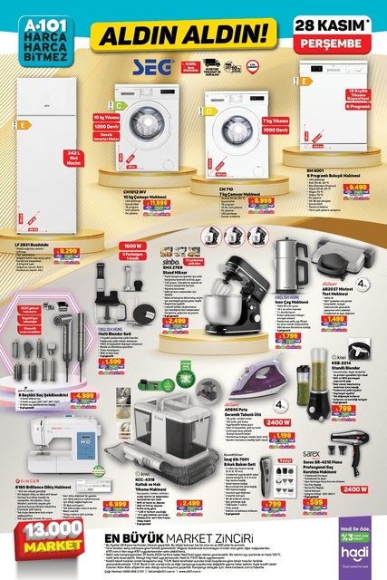 A101, 28 Kasım 'Aldın Aldın' kataloğunu Perşembe gününden itibaren satışa çıkarıyor. Bu hafta markete; hamur yoğurma makinesi, saç şekillendirici, dikey süpürge, koltuk-halı yıkama makinesi, masa takımı, tencere, kirli sepeti, klima, elektrikli moped, kamp malzemeleri gibi onlarca ürün geliyor. İşte, A101 28 Kasım aktüeli...