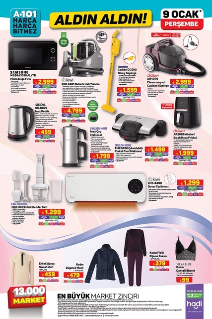A101, 9 Ocak 2025 aktüel kataloğunu yayınladı. Bu hafta zincir markete; mikrodalga, dikey süpürge, tost makinesi, kettle, blender seti, fritöz gibi küçük ev aletleri geliyor. İşte, A101 9 Ocak 2025 aktüel kataloğu...
