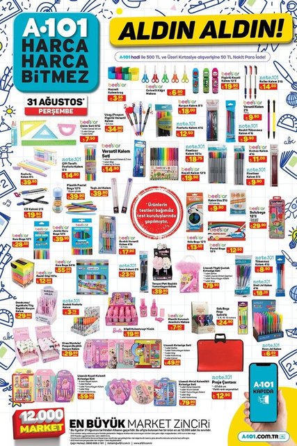 A101 aktüel ürünler kataloğu okulların açılmasına kısa bir süre kala takip edilmeye başlandı. 31 Ağustos Perşembe A101 aktüel ürünler kataloğu, marketin resmi internet sitesi üzerinden yayınlandı. 31 Ağustos Perşembe günü A101 aktüel ürünler kataloğunda yer alan defter çeşitleri, çanta çeşitleri ve kalem çeşitleri raflardaki yerini aldı. İşte 31 Ağustos A101 aktüel ürünler kataloğu indirim listesi...