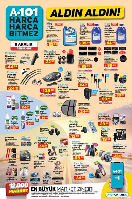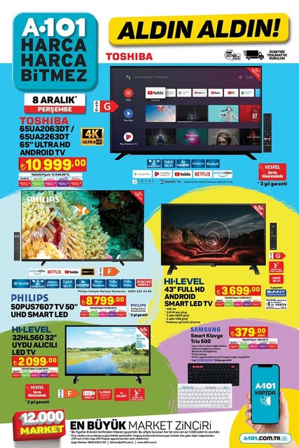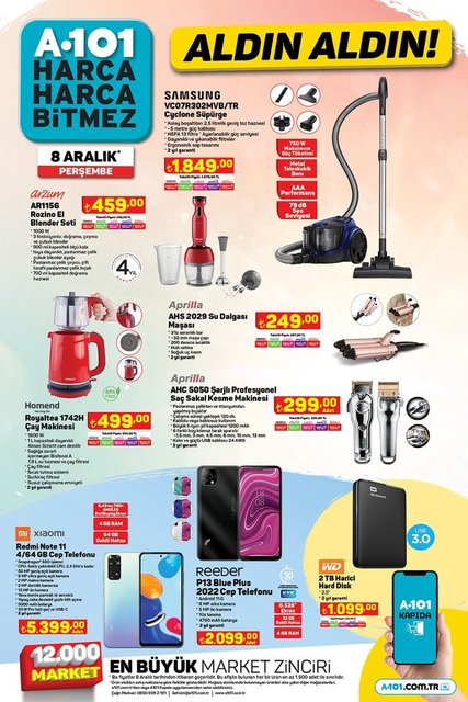 A101 aktüel ürünler kataloğunda bu hafta; Ultra HD Android TV'ler, smart klavye, filtre kahve makinesi, kahve ve baharat öğütücü, çikolata çeşitleri, çeşitli atıştırmalıklar, kağıt havlu, süpürge, çay makinesi, saç-sakal kesme makinesi, baza başlık seti, farklı boyutlarda valizler, araç bakım ürünleri, ankastre set, beyaz eşyalar ve daha birçok ürün A101 marketlerinde müşterilerle buluşuyor. İşte 8 Aralık Perşembe A101 fırsatları...