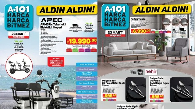 A101 aktüel ürünler kataloğu indirimli ürünler listesi ile birbirinden farklı onlarca ürün satışa çıkıyor. A101 aktüel ürünler kataloğunda yer alan beyaz eşya çeşitleri, küçük ev aletleri, koltuk takımı ve elektrikli moped 23 Mart 2023 Perşembe gününden itibaren satışa sunuluyor. İşte, 23 Mart Perşembe A101 aktüel ürünler kataloğu tam fiyat listesi...