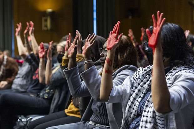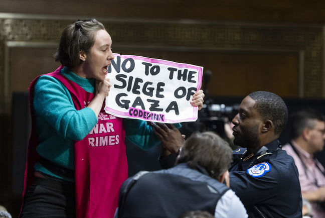 Duruşmayı kesintiye uğratanlardan bazıları, aynı zamanda ABD'ye Ukrayna'ya silah göndermeyi durdurma çağrısında bulunan savaş karşıtı CODEPINK grubuyla bağlantılı. Pek çok kişi pembe giydi ve ellerinde "Gazze kuşatmasına hayır" yazılı pankartlar açarak ABD'yi İsrail'e fon göndermeyi durdurmaya çağırdı.