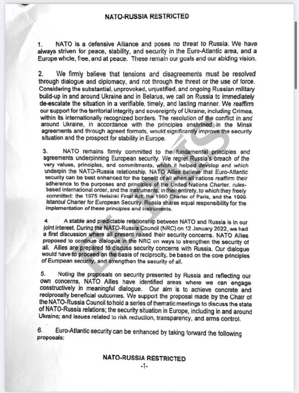 Her iki belgede de ABD ve NATO, Rusya ile ikili bir güvenlik anlaşması imzalanması ve NATO'nun Ukrayna'ya kapılarını kapatması önerilerini reddetti.