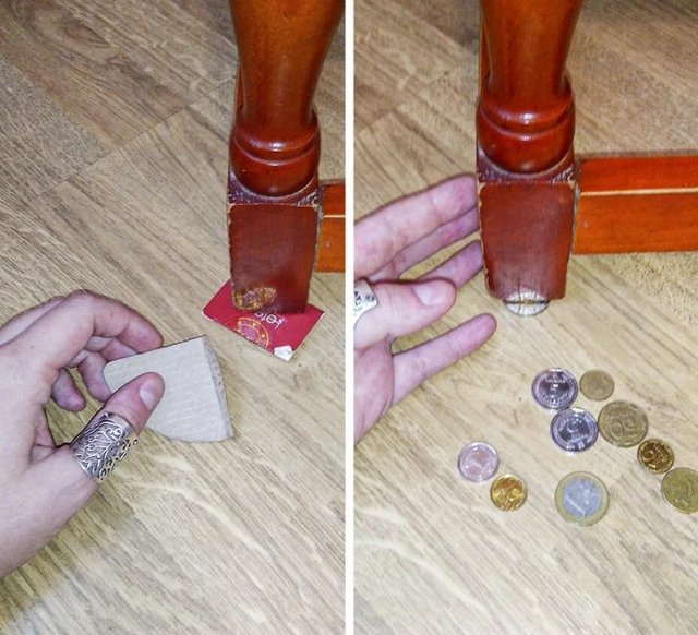 Bazen mobilyalarınızın ayakları sallanmaya başlar ve insanlar genellikle sabitlemek için o bölgeye kağıt koyarlar. Bunun yerine bir bozuk para koyabilirsiniz, kağıt yırtılabileceğinden ve madeni paralar sağlam olduğundan bu çözüm daha güvenilir olabilir.