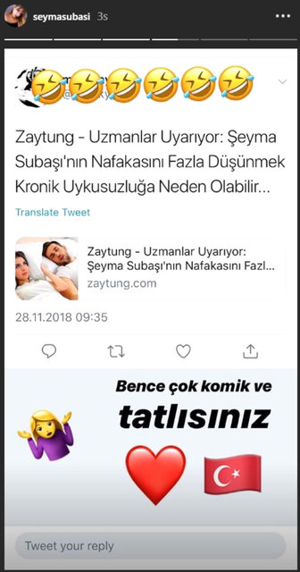 Şeyma Subaşı, internette dolaşan, "Uzmanlar uyarıyor! Şeyma Subaşı'nın nafakasını fazla düşünmek kronik uykusuzluğa neden olabilir" yazısını paylaştı. Subaşı fotoğrafa şu yorumu yaptı: Bence çok tatlı ve komiksiniz.