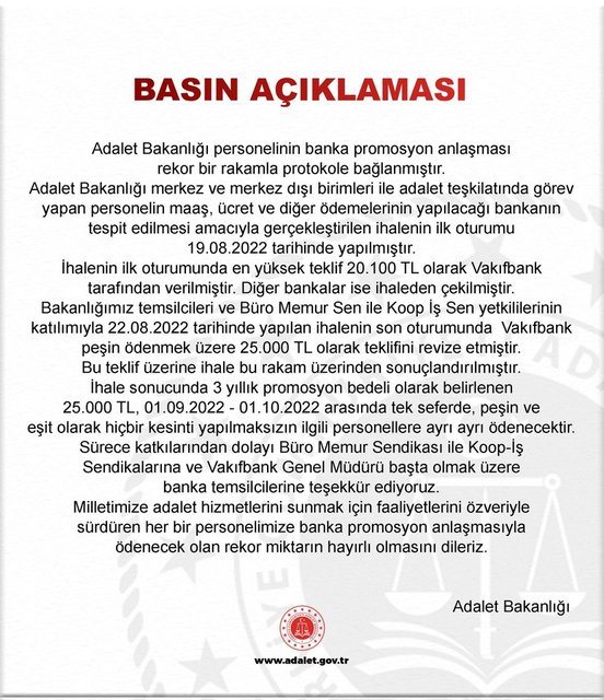 ''Adalet Bakanlığı personelinin banka promosyon anlaşması rekor bir rakamla protokole bağlanmıştır. Adalet Bakanlığı merkez ve merkez dışı birimleri ile adalet teşkilatında görev yapan personelin Maaş, ücret ve diğer ödemelerinin yapılacağı bankanın tespit edilmesi amacıyla gerçekleştirilen ihalenin ilk oturumu 19.08.2022 tarihinde yapılmıştır.