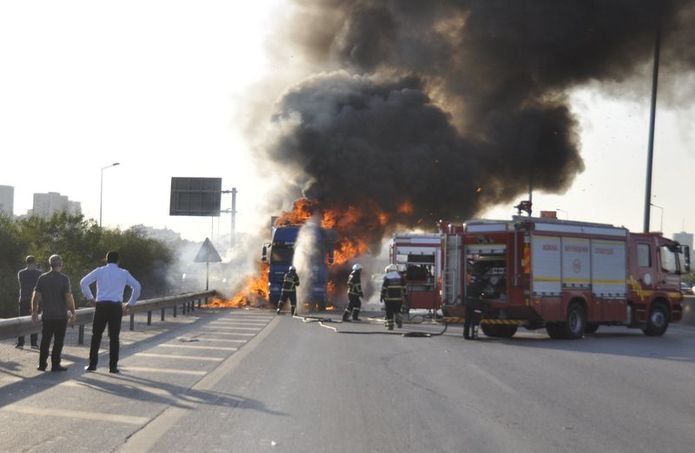 Adana'da, Mersin Limanı'ndan yüklediği oyuncakları Suriye'ye götüren TIR'ın otoyolda patlayan lastiği alev aldı. Bir anda alev topuna dönen aracını yolun kenarına çeken şoför canını zor kurtardı. Yangında 12 ton oyuncak küle dönerken, şoför aracının yanışını çaresizlik içinde izledi