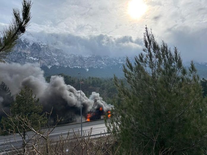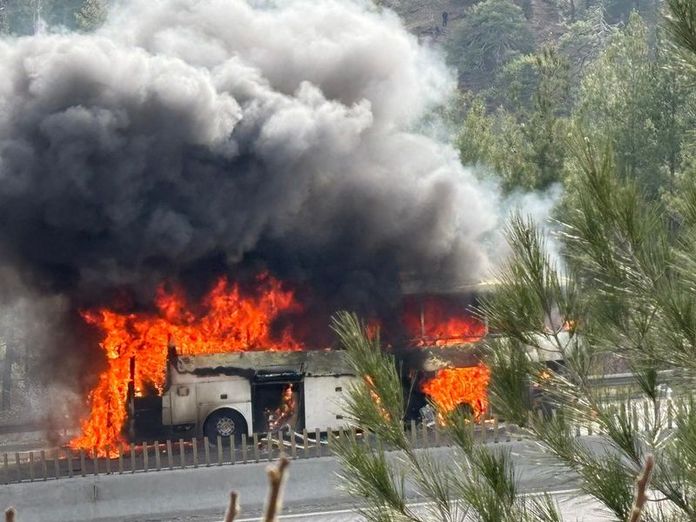 AA'da yer alan habere göre otobüs şoförü Üner, alevleri fark edince aracı emniyet şeridine çekti, yolcuların da tahliyesini sağladı. İhbar üzerine bölgeye sevk edilen itfaiye ekipleri, yangını söndürdü.