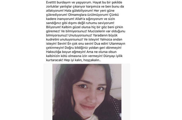 Utanmayın çekinmeyin, doğru bildiğiniz yoldan geri dönmeyin. Haksızlığa boyun eğmeyin. Ama ne olursa olsun kalbinizin kötü olmasına izin vermeyin. Dünyayı iyilik kurtaracak. Hep iyi kalın hoşça kalın" notunu paylaştı.