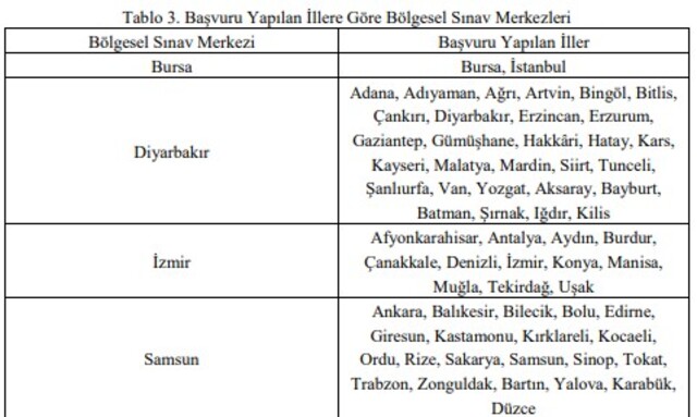Uygulama sınavı 10 - 28 Şubat 2025 tarihleri arasında Bursa, Diyarbakır, İzmir ve Samsun illerinde yapılacaktır. Adaylar Tablo 3’te tercih ettikleri ilin yer aldığı grubun hizasında gösterilen bölgesel sınav merkezinde sınava katılacaklardır.