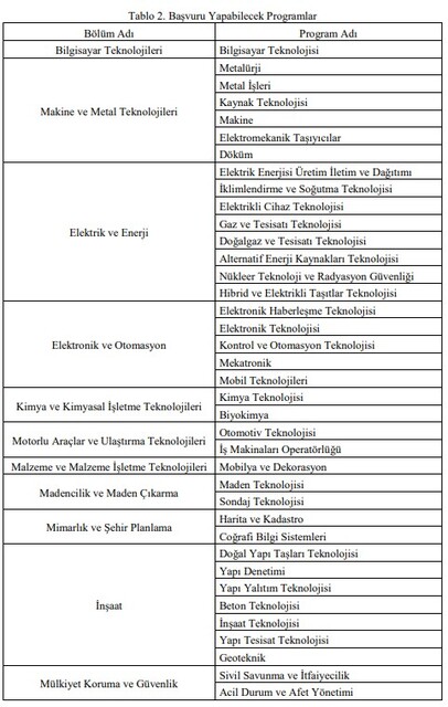 Önlisans düzeyinde öğretim veren kurumların Tablo 2’de yer alan programlarından mezun olmak.