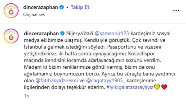Instagram hesabından paylaşım yapan Azaphan, "Kardeşimiz sosyal medya ekibimize ulaşmış. Kendisiyle görüştük. Çok sevindi ve İstanbul’a gelmek istediğini söyledi. Pasaportunu ve vizesini yetiştirebilirse, iki hafta sonra oynayacağımız Kocaelispor maçında kendisini locamda ağırlayacağımın sözünü verdim. Madem ki bizim renklerimize gönül vermiş, bizim de onu ağırlamamız boynumuzun borcu." dedi.