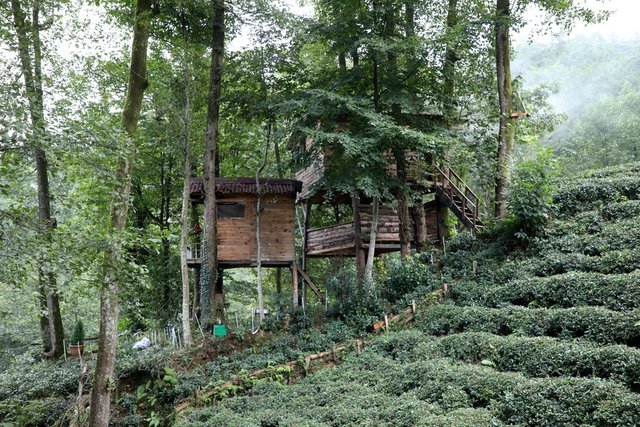 Rize'de yaşayan Murat Aksoy, babası ve kardeşinin yardımıyla kızılağaçların gövdeleri arasına yaptığı ahşap evlerde yakınlarını misafir ediyor